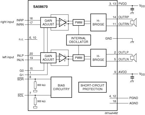 SA58670的每个通道具有独立的关断控制。增益可以通过增益选择引脚G0和G1设置为6 dB、12 dB、18 dB或24 dB 。更强的抗噪性和RF整流可通过高PSRR和差分电路拓扑提高。快速启动时间和小型封装使其成为手机和PDA这两者的理想选择。