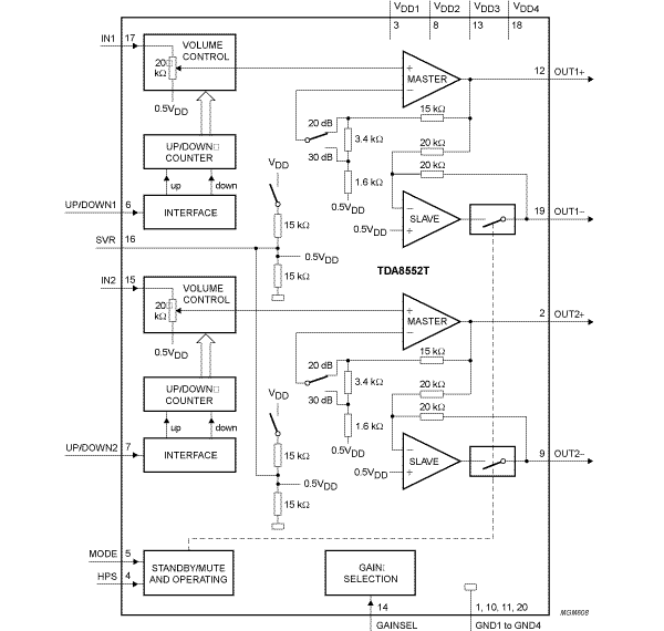 TDA8552T采用20针小型封装。对于TDA8552TS,其采用20针超小型封装,最大输出功率由允许的最大环境温度加以限制。更多信息可在“热设计考虑因素”一节中找到。SO20封装具有连接到芯片焊盘的四角引线,从而热行为可以由PCB布局进行改善。