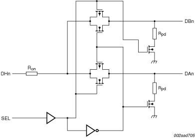 Each host port pin is multiplexed to one of two DIMM port pins. When the SEL pin is HIGH the A DIMM port is turned on and the B DIMM port is off. The ON-state connects the host port to the DIMM port through a 20 Ω nominal series resistance. When the port is off a high-impedance state exists between the Host and disabled DIMM. The DIMM port is terminated with a 100 Ω resistor to ground. When the SEL pin is LOW the B DIMM port is turned on and the A DIMM port is off.