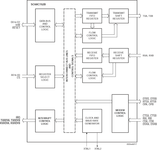 SC68C752B是一款两路通用异步接收器/发送器(UART),带有64字节FIFO、自动硬件/软件流控制以及最大5 Mbit/s的数据速率。SC68C752B提供增强的功能。它具备传输控制寄存器(TCR),能储存硬件和软件流控制过程中用于开始/停止传输的接收器FIFO阈值电平。通过FIFO Rdy寄存器,软件能在一次访问中获取所有四个端口的TXRDYn/RXRDYn状态。片上状态寄存器为用户提供错误指示、操作状态和调制解调器接口控制。可定制系统中断以满足用户需求。内部环回能力允许进行板载诊断。