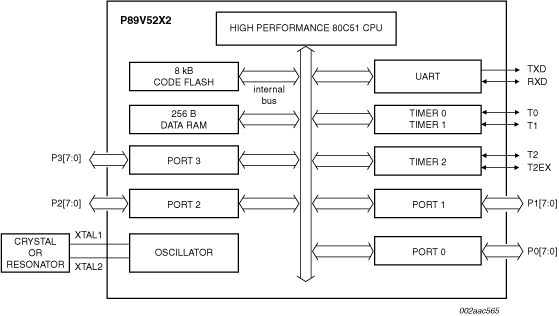The P89V52X2 is an 80C51 microcontroller with 8 kB flash, 256 B of data RAM, and 192 B of data EEPROM. This device is designed to be a drop in and software compatible replacement for the P87C52, P87C52X2, P89C52, and P89C52X2 devices.