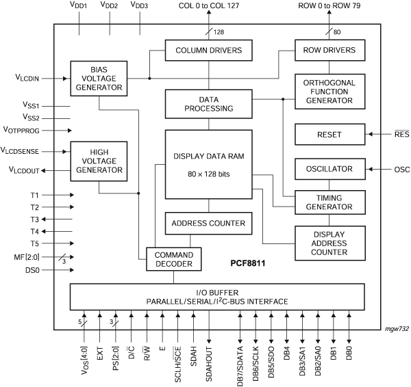PCF8811是一款低功率CMOS1LCD控制器和驱动器,为驱动80行和128列的图形显示或79行和128列以及一个128符号图标行的图形显示而设计。单个芯片提供了显示所需的所有功能,包括片上生成VLCD和LCD偏置电压,从而实现最少的外部组件和低功耗。PCF8811可通过并行总线、串行总线或I²C总线接口连接微控制器。