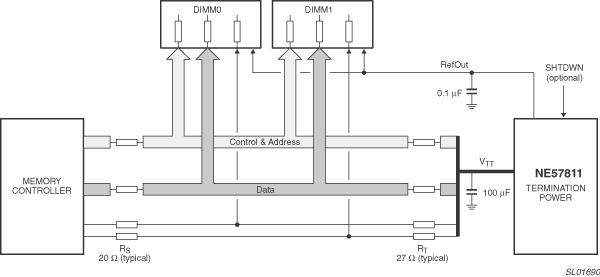 The NE57811 is designed to provide power for termination of a Double Data Rate (DDR) SDRAM memory bus. It significantly reduces parts count, board space, and overall system cost compared to previous solutions.