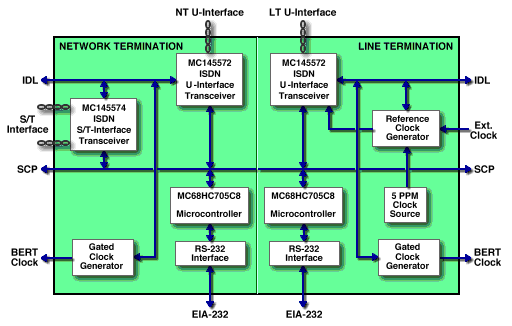 The user is provided with a fully functional NT1 (Network Termination Type 1) connected to an LT (Line Termination). An NT1 provides transparent 2B+D data transfer between the U- and S/T-Interfaces. In addition, it provides for network-initiated maintenance procedures. The MC145572EVK does not terminate ISDN call control or maintenance messages