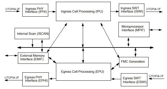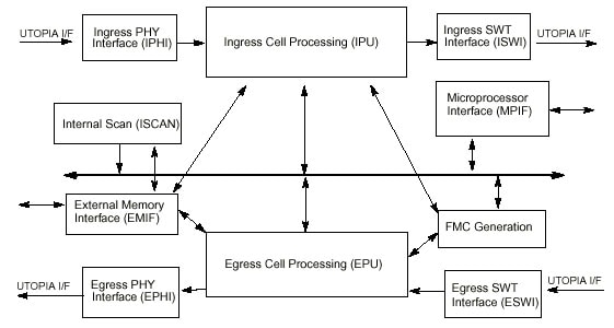 The physical interface (PHY-IF) implements the physical layer functions of the broadband ISDN (B-ISDN) protocol reference model. This includes the physical medium dependent functions required to transport ATM cells between the ATM user and the ATM switch (i.e., a user-network interface or UNI) or between two ATM switches (i.e., a network-node interface or NNI). The cells are transferred between the physical interface and the MC92520 using the UTOPIA standard. The MC92520 implements ATM layer functions required to transfer cells to and from the switch over virtual connections. These functions include usage enforcement, address translation, and operation and maintenance (OAM) processing.