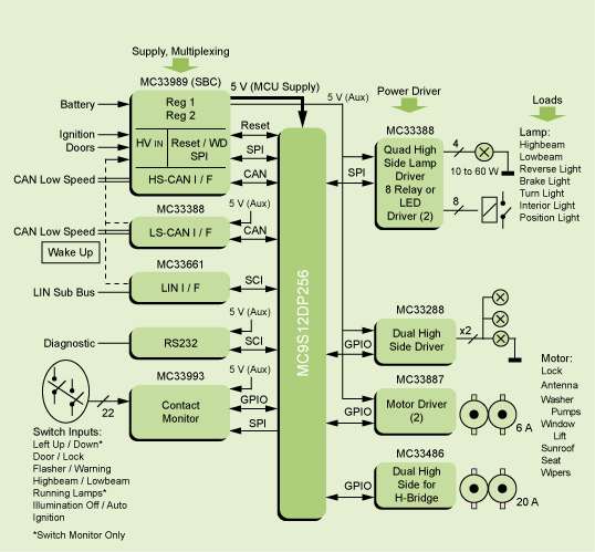 The MC33388 is a CAN physical interface device, dedicated to automotive body electronic multiplexing applications. It operates in differential mode, allowing ground shifts up to 1.5V, reducing RFI disturbances. It offers very low standby current in sleep and standby mode operation, and supports communication speeds up to 125kBauds. It is fully protected against harsh automotive environments and the driver is able to detect fault conditions and automatically switches into appropriate default mode. Under fault condition, it continuously monitors bus failures in order to switch back to normal bus operation as soon as faults disappeared.