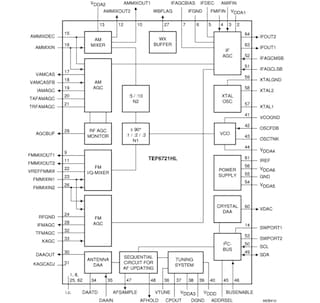 TEF6721HL是单芯片汽车无线电调谐器,适用于AM、FM标准、FM带内同频数字音频广播(IBOC DAB)和气象波段,为SAF7730H提供综合的AM和FM增益控制差分中频(IF)输出,包括如下功能: