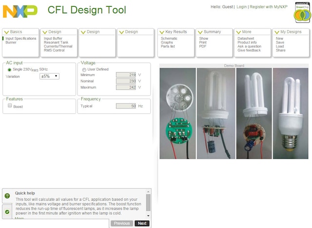 The CFL Design Tool enables easy design of a complete compact fluorescent lamp using NXP®s GreenChip UBA2211 or UBA2213 high voltage ICs.