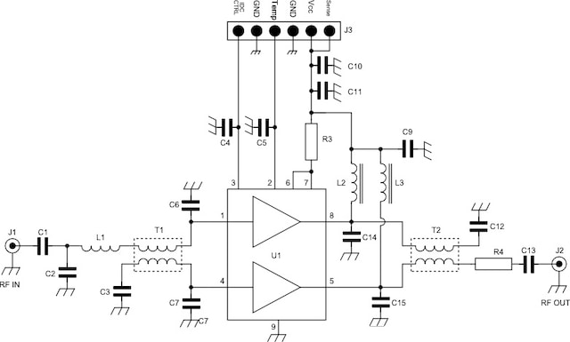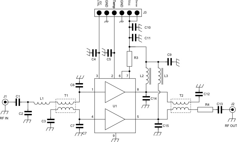 Demoboard for BGA3023, 1.2 GHz 20 dB gain wideband amplifier application.