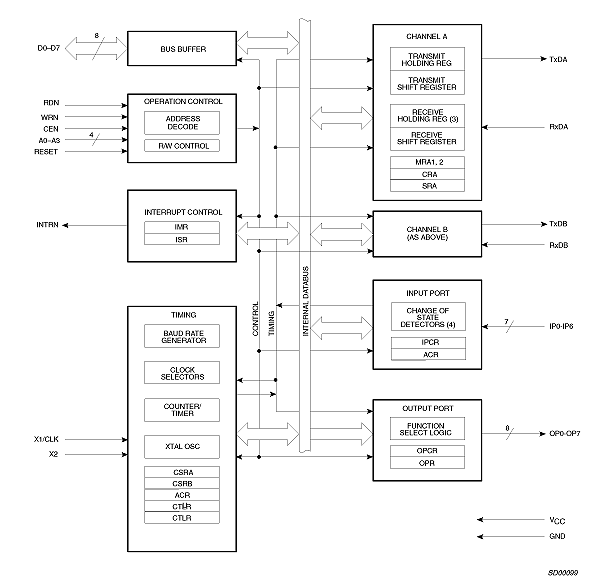 可对各通道的工作模式和数据格式进行单独编程。另外,每个接收器和发送器可将其工作速度选为十八个固定波特率、源自可编程计数器/定时器的16×时钟或外部1×或16×时钟之一。可从晶体或从外部时钟输入直接操作波特率生成器以及计数器/定时器。接收器和发送器工作速度的独立编程能力使DUART特别适合双速通道应用,如集群终端系统。