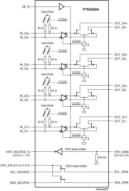 PTN3360A主高速差分通路具备符合DisplayPort标准v1.1和/或PCI Express标准v1.1电气规格的低摆幅自偏置差分输入,以及符合DVI v1.0和HDMI v1.3a电气规格的开漏电流导引差分输出。I2C总线通道对3.3 V(源端)和5.0 V(目的端)之间的DDC信号进行电平变换。