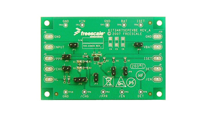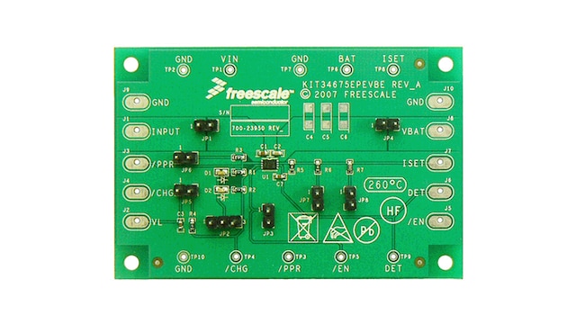 The KIT34675EPEVBE evaluation kit supports the 34675 charger for single-cell Li-Ion batteries, which eliminates the input over-voltage protection (OVP) circuit required in handheld devices such as cell phones, Bluetooth accessories, and portable media players.