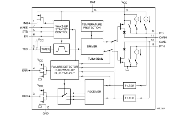 The TJA1054A is the interface between the protocol controller and the physical bus wires in a Controller Area Network (CAN). It is primarily intended for low-speed applications up to 125 kBd in passenger cars. The device provides differential receive and transmit capability but will switch to single-wire transmitter and/or receiver in error conditions.
