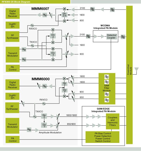Two devices (MMM6000 and a GSM/EDGE integrated PA) combine to function over the GSM850, EGSM900, DCS1800 and PCS1900 frequency bands. Two other devices (MMM6007 and a WCDMA Integrated PA) make up the WCDMA (UMTS) portion to complete the full WCDMA/EDGE radio subsystem.