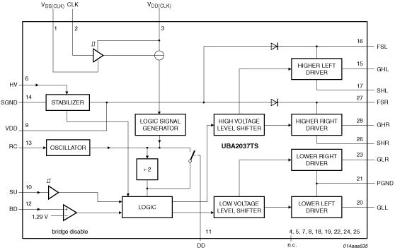 UBA2037TS是一款高压单片集成电路(IC),采用高压绝缘硅(HVSOI)工艺制造。该电路用于驱动全桥配置的MOSFET。此外,它还具有禁用、内部可调节振荡器和外部时钟输入功能,以及用于驱动电桥的高压电平转换器。为了保证精确的50%占空比,振荡器信号可先经过一个分频器然后馈送到输出驱动器。UBA2037TS特别适用于投影仪和通用照明应用的高强度放电(HID)灯驱动器。