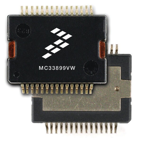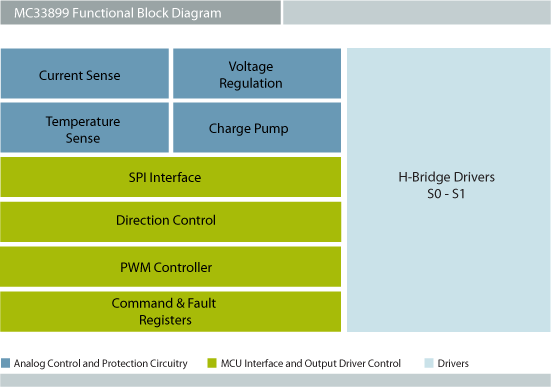 The NXP® MC33899 is designed to drive a DC motor in both forward and reverse shaft rotation under pulse-width modulation (PWM) control of speed and torque.