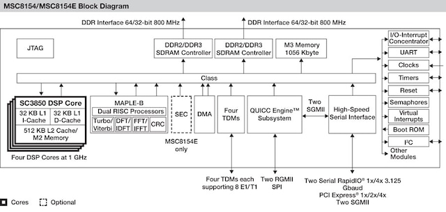 MSC8154 DSP具有较高的性能和集成度,整合了4个运行频率均为1 Ghz、完全可编程的全新和增强型SC3850 DSP内核,以及针对无线基础架构应用而高度优化的架构。在片上集成的MAPLE-B基带加速器由恩智浦开发,为Turbo和Viterbi通道解码以及DFT/iDFT和FFT/iFFT算法提供硬件加速支持,同时包含CRC处理。基于内部RISC的QUICC Engine®子系统支持多种联网协议,从而保证在分组网络上可靠地传输数据,同时大幅减轻DSP内核的处理负载。