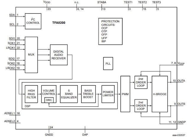 The TFA8200 is a highly power-efficient DSP embedded class-D audio amplifier solution associated with audio enhancement which features: