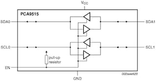 当VCC= 0 V时,PCA9515的SCLn/SDAn Ci约为200 pF,相比正常值 < 10 pF。在能保证转发器电源但任一组SCLn/SDAn引脚仍保持在有效总线上的应用中,应使用更新的PCA9515A以防总线负载增加。另外,PCA9515A具有2.3 V至3.6 V的更大电压范围且可用于更低电压电源限制的应用中。