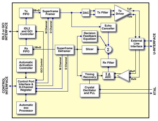 The MC145572 U-Interface Transceiver is a single-chip device for Integrated Services Digital Network Basic Access Interface that conforms to the American National Standard ANSI T1.601-1992 and ETSI ETR 080. The device, which can be configured for LT (Line Termination) or NT (Network Termination) applications, performs all necessary Layer 1 functions while utilizing 2B1Q line coding.
