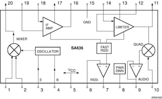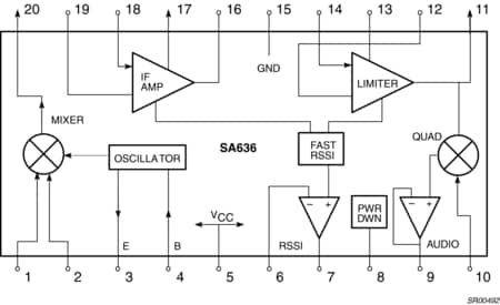 SA636是具有高速RSSI的低功耗高性能单片FM IF系统,集成了一个混频器/振荡器、两个限幅中频放大器、正交检波器、对数接收信号强度指示器(RSSI)、电压调节器、宽带数据输出以及快速RSSI运算放大器。SA636采用20引脚SSOP(紧缩小型封装)和HVQFN20(四侧扁平封装)。