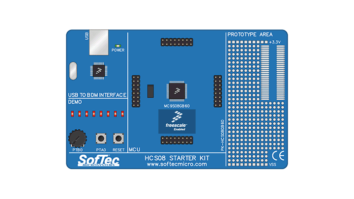 PK-HCS08GB60入门套件专为评估MC9S08GB60微控制器和调试小型用户应用而设计。该入门套件利用CodeWarrior®集成开发环境(整合了编辑器、汇编器、C语言编译器和调试器)和恩智浦BDM接口,可让用户将其应用下载到微控制器的闪存中并进行调试。Together with 该入门套件与CodeWarrior®相结合,为您提供编写、编译、下载、在线仿真和调试用户代码所需的一切。全速程序执行使您能够实时执行硬件和软件测试。该入门套件通过USB端口连接到主机。原型设计区允许您连接自己的小型应用。