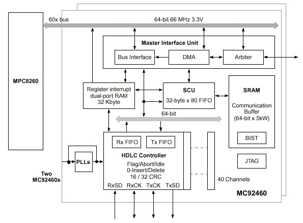 The MC92460 is a 40-channel, high-level data link controller (HDLC) with an aggregate throughput of up to 2 Gbps across a synchronous optical network (SONET). A total of eight of these peripheral devices can be connected to the 60x bus of the MPC8260 or the MPC603e.