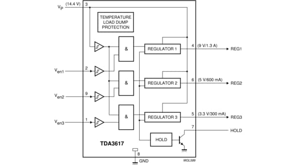 TDA3617是一款多路输出稳压器,提供三个独立的稳压器。它包含: