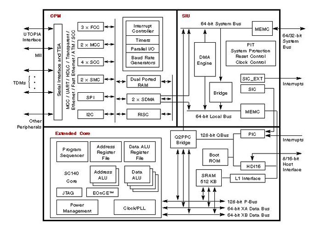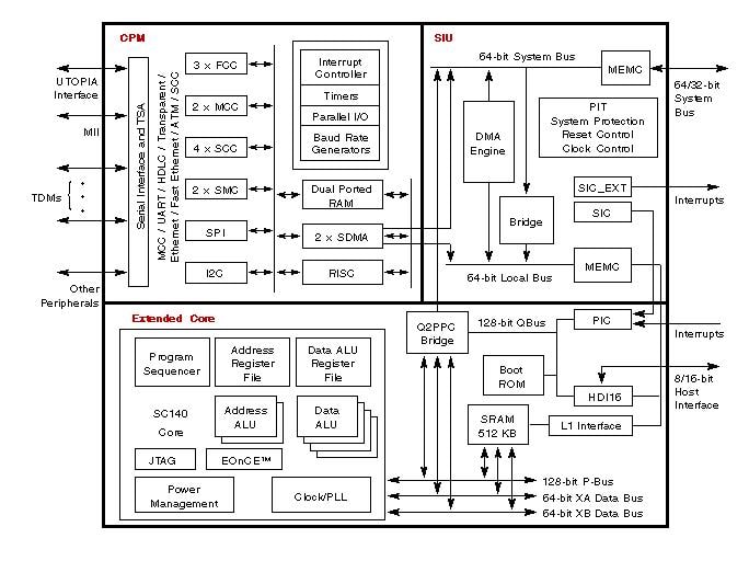 Communications Processor Module (CPM), a 64-bit 60x-compatible system bus, a