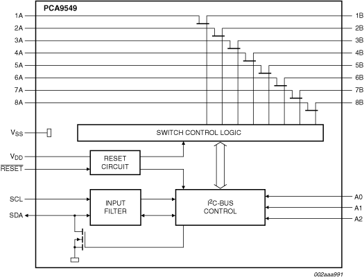 PCA9549提供由I²C总线控制的兼容TTL的8位高速总线开关。该开关的低通态电阻允许以最小的传播延迟进行连接。任何单独的A到B通道或通道组合都可以通过I²C总线进行选择,具体如何选择取决于可编程控制寄存器的内容。当I²C总线位为高电平(逻辑1)时,开关打开,数据可以从端口A流向端口B,反之亦然。当I²C总线位为低电平(逻辑0)时,开关断开,可在两个端口之间形成高阻抗状态,从而停止数据流。