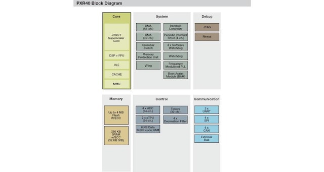The PXR40 Power Architecture MCU provides strong computing power with its 264 MHz clock speed and on-chip digital signal processing. Coupled with 4 MB of on-chip flash, quad ADCs, 64-channel dual timing unit and 256K RAM (for data storage), the designer has significant on-chip features to reduce external components.