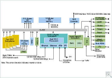 An internal QUICC Engine® dual-RISC packet-processor supports multiple networking protocols to guarantee reliable data transport over packet networks while significantly offloading such processing from the DSP cores.