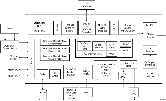 The CX2425x family offers an MPEG®-2 MP@ML decoder (Dolby Digital audio is optional), multiple transport stream inputs, a transport processor, a 32-bit RISC CPU, a 2D graphics accelerator, a TV encoder, a channel 3/4 RF modulator, a video/graphics display compositing controller, and a set of peripheral I/O ports for set-top box (STB) front and back panel connectors.