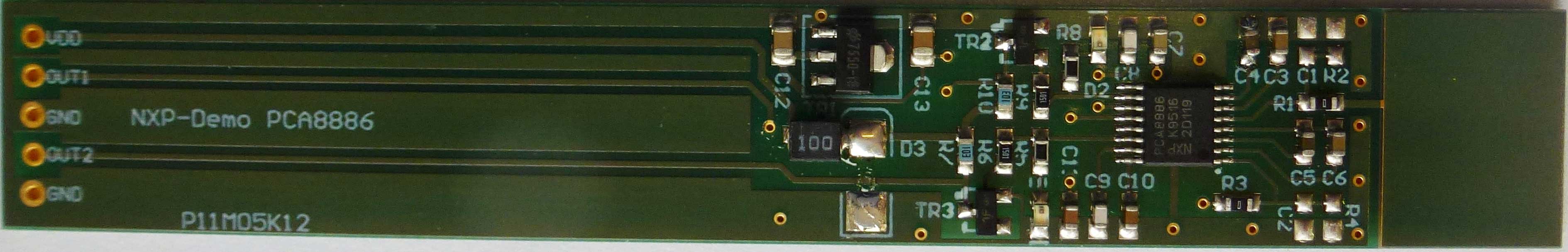 This OM11052 board demonstrates the high sensitivity and reliable functionality of the dual channel touch and proximity sensor PCA8886.