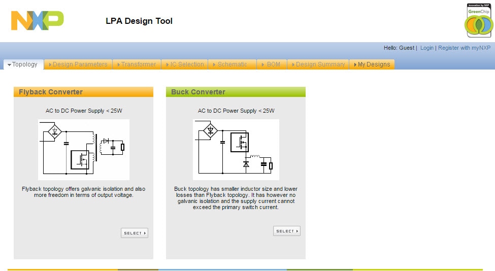 For today's short product development cyclesas short as possible, NXP® helps you simplify your design with intuitive online tools. Our latest design tool focuses on creating low power supply solutions from 2 W up to 25 W. The online tool supports two different application types - an isolated (flyback) converter and a non-isolated (buck) converter.