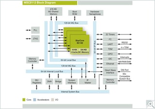 MSC8113是一款高度集成的片上系统(SoC),整合了3个StarCore SC140扩展内核、一个RS-232串行接口、4个时分复用(TDM)串行接口、32个通用定时器、一个灵活系统接口单元(SIU)、一个以太网接口和一个多通道DMA控制器。3个扩展内核以300/400 MHz的频率提供3600/4800 DSP MMACS的总体性能。