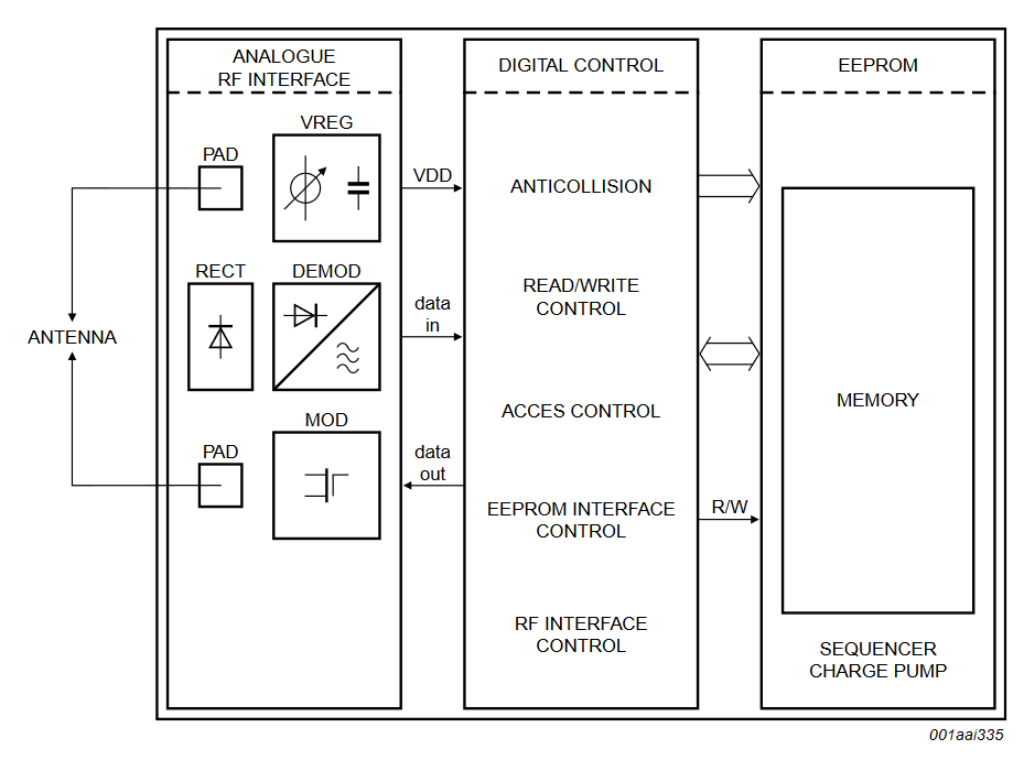 该标签无需内部电源。其非接触式接口通过天线电路,以询问器(读/写设备)传播的能量作为电源,而系统时钟则来自片内振荡器。从询问器到UCODE HSL标签的数据通过非接触式接口解调,然后调制询问器电磁场,以便从UCODE HSL标签向询问器传输数据。