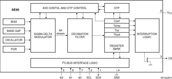 该器件包含一个在温度超过编程极限时变为有效的开漏输出(引脚OS)。共有三个可选逻辑地址引脚(引脚A2至A0),因此可在同一总线上连接八个器件而不会发生地址冲突。