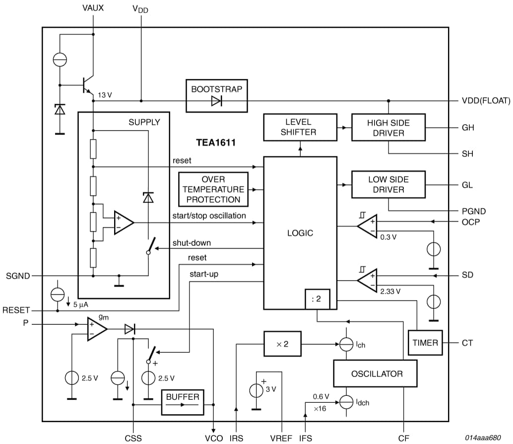 TEA1611T是通过高压扩散金属氧化物半导体(DMOS)工艺制成的单片集成电路,这是用于零电压开关谐振转换器的高压控制器。该IC可驱动半桥配置中的两个分立功率MOSFET。其还包括一个自举电路,一个具有精确可编程频率范围的振荡器,一个闩锁关断功能以及一个跨导误差放大器。