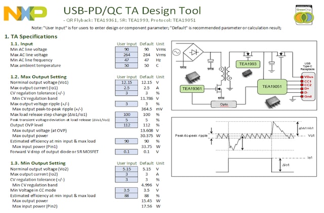 The NXP® USB-PD3.0 / QC4.0 smart charging design tool helps you design a fast charging adapter supporting BC1.2, USB-PD3.0 and/or QC4.0 charging protocol. NXP's primary QR Flyback controller TEA1936x and secondary side synchronous rectifier controller TEA199x are very suited for a low-cost solution.