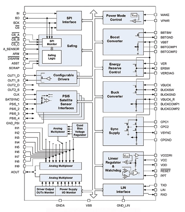 恩智浦®MC33789是一个面向安全气囊应用的混合信号IC,为用于乘用车及其它车辆的各种安全气囊提供高性价比、灵活的系统IC解决方案。