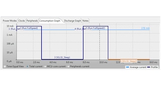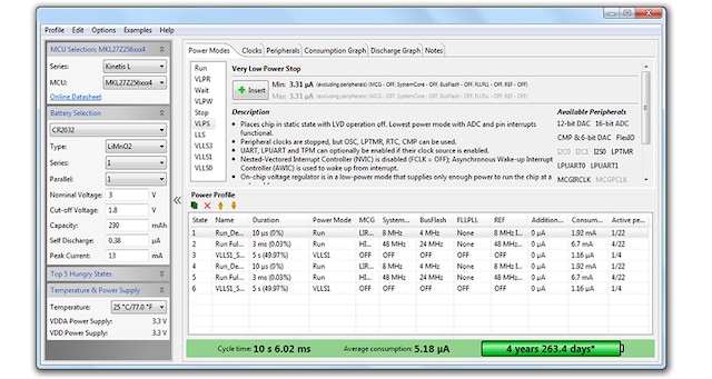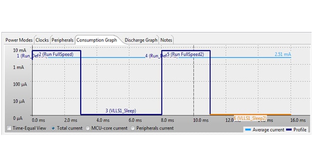 只需安装该工具(下载)或使用在线工具(MCUXpresso配置工具),添加您的系统的详细信息 - 包括电源模式、时钟模式、外设设置和每个系统状态的持续时间。它还可以直接提供系统功率估算的结果,包括平均电流、电池寿命和功耗图表。