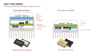 恩智浦的顶部冷却技术可以使5G mMIMO射频器件更轻薄,无需专用的射频屏蔽,也可以将散热管理和射频设计分开。恩智浦的首款顶部冷却器件是为64T64R (320W)或32T32R (200W)的mMIMO射频器件而设计的,可覆盖3.3GHz到3.8GHz频率。该模块结合了恩智浦自主研发的LDMOS和GaN半导体技术,实现了高增益和高效率,同时具有宽带性能,能够在400MHz的瞬时带宽上提供31dB的增益和46%的效率。