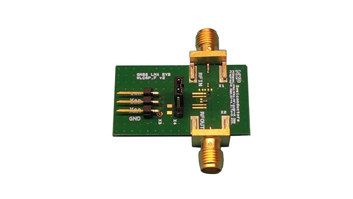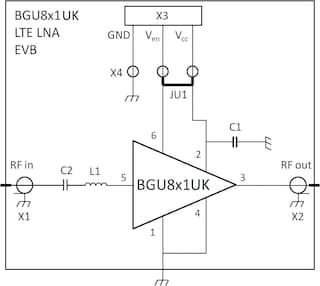The BGU8M1UK LTE LNA evaluation board simplifies the evaluation of the BGU8M1UK LNA for the LTE application. The evaluation board enables testing of the device performance and requires no additional support circuitry. The board is fully assembled with the BGU8M1UK, the input series inductor, input DC blocking capacitor and a decoupling capacitor. The board is supplied with two SMA connectors for input and output connection to RF test equipment. The BGU8M1UK can operate from a 1.5 V to 3.1 V single supply and consumes about 4.3 mA.