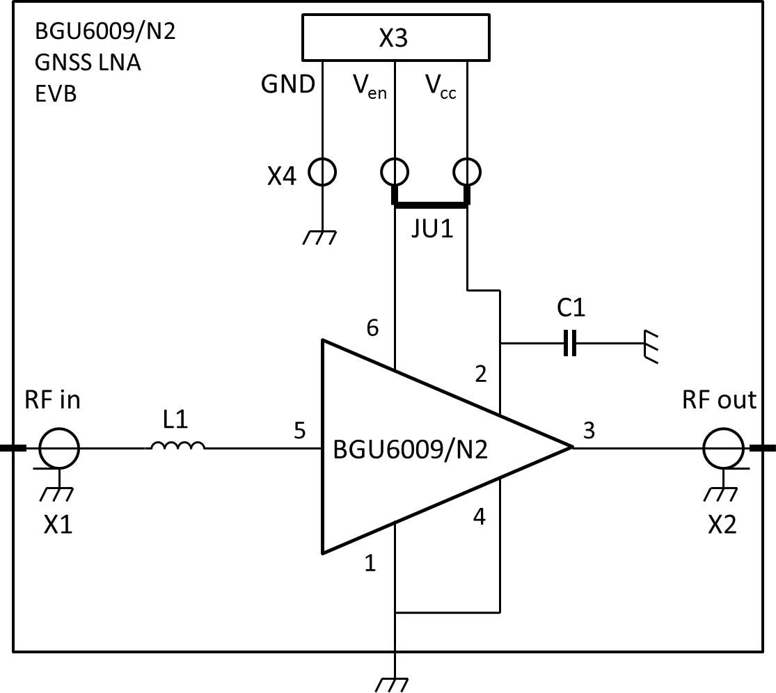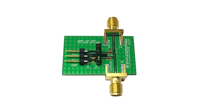 The BGU6009/N2 GPS LNA evaluation board simplifies the evaluation of the BGU6009/N2 LNA for the GPS application. The evaluation board enables testing of the device performance and requires no additional support circuitry. The board is fully assembled with the BGU6009/N2, the input series inductor and a decoupling capacitor. The board is supplied with two SMA connectors for input and output connection to RF test equipment. The BGU6009/N2 can operate from a 1.5 V to 3.1 V single supply and consumes about 5.1 mA.