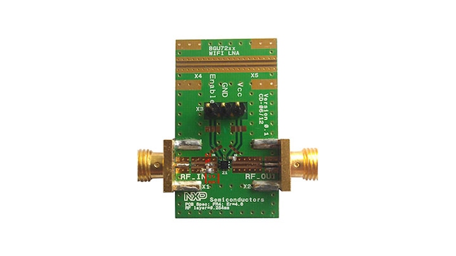 5GHz WiFi LNA评估板可简化对BGU7258应用的评估。该评估板支持测试器件性能,无需其他的支持电路。它完整装配了BGU7258 MMIC,并包含4.7nF直流解耦电容和0.3pF输入匹配电容。还配有两个SMA连接器,用于与射频测试设备的输入和输出连接。评估板上提供一根50Ω的“直通线”,这样如果用户希望验证射频连接器和地共面波导损耗,则可以去除嵌入。