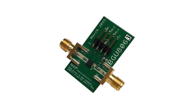 BGU8063评估板能够简化BGU8063的射频评估。该评估板支持测试器件射频性能,无需其他的支持电路。BGU8063评估板装配在一个35 x 20 mm,1 mm厚的3层PCB上,采用0.2 mm (8 mill) R4003C进行射频性能测试。该电路板完整安装BGU8063,包含外部组件。该电路板配有两个SMA接头,用于连接射频测试设备的输入和输出。