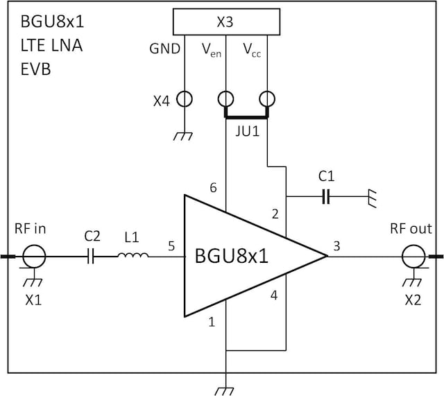 The BGU8L1 LTE LNA evaluation board simplifies the evaluation of the BGU8L1 LNA for the LTE application. The evaluation board enables testing of the device performance and requires no additional support circuitry. The board is fully assembled with the BGU8L1, the input series inductor and a decoupling capacitor. The board is supplied with two SMA connectors for input and output connection to RF test equipment. The BGU8L1 can operate from a 1.5 V to 3.1 V single supply and consumes about 4.6 mA.