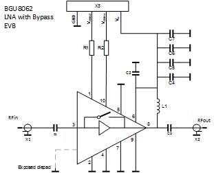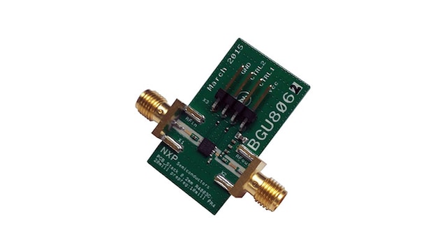 BGU8062评估板能够简化BGU8062的射频评估。该评估板支持测试器件射频性能,无需其他的支持电路。BGU8062评估板采用35 mm x 20 mm x 1 mm 3层PCB来制造。0.2 mm (8 mill)顶层使用ROGERS R4003C以获得最佳射频性能。该电路板完整安装BGU8062,包含外部组件。该电路板配有两个SMA接头,用于连接射频测试设备的输入和输出。