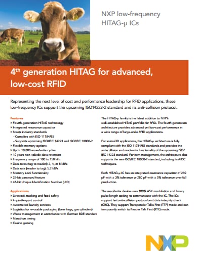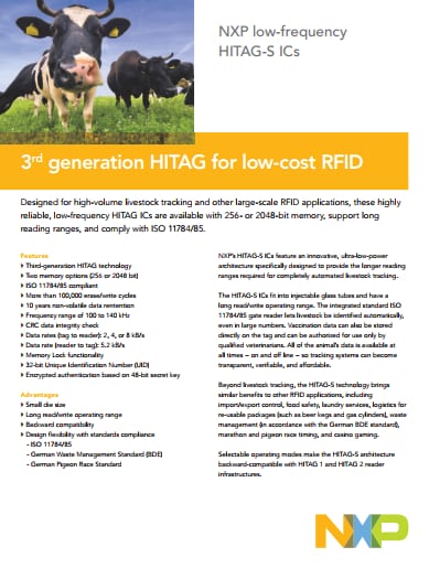 HITAG系列中所采用的应答器IC不仅符合ISO 11784/85和ISO 14223动物识别标准,以及ISO 18000-2工业标准。HITAG应答器IC采用的是超低功耗设计,可提供家畜追踪所需的长距离读取范围。